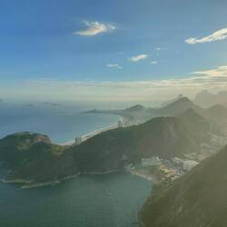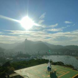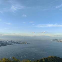 We didn't linger too long after getting our pictures because we had to make our way across Rio to get to Sugar Loaf in time for our time slot. We again waited in the long line to get in the small train back down the mountain and with all of the tourist traffic for Carnaval, it took a little while to catch an uber and make our way across the city. Thankfully we made it in time for our time slot, but it was a bit close. Sugar Loaf has two hill tops connected to the ground by cable cars. We didn't have to wait in a line for our first cable car to the first peak. I was surprised when we got to the top. There were shops, restaurants, and even a DJ and people dancing! We met up with our Chinese friends, Ge and Yating, and got the second cable car to the next, slightly higher, peak. This peak also had some shops and restaurants, but much smaller than the other peak. We could see Christ the Redeemer in the distance, but the angle of the sun made it tricky to get good pictures. We had some acai at the top and got some pictures of the sun because it was a good view for the sunset before the sun would dip behind the mountains. While we were up there, it was getting busier with people finding a spot on the balcony for the sunset. Having got some pictures already, and knowing more people would be crowding this space, we went in the cable car back down to the first peak. It still had nice views of the sunset and Christ the Redeemer.