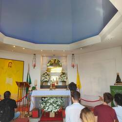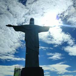Once we reached the top, we disembarked the train and walked up the steps. We did have to make a pit stop for over priced tourist food in the tiny restaurant just under Christ's feet. After our crappy cheese fries and ham and cheese croissant, we finished the short walk up the stairs to see Christ the Redeemer. It was busy, and the sun was just over His left shoulder, so it was hard to get good pictures. We popped our heads into the small chapel inside Christ where about ten people could fit and take part in the service that was taking place. Christ the Redeemer is such an icon of Rio de Janeiro, but we were surprised by how small it was in real life. It always looks so much bigger in pictures and movies on top of the hill. It was still really cool to see, but yeah, much smaller than we thought. The views from the top of Christ the Redeemer's mountain top were pretty impressive. We could see a majority of Rio stretching out below us: all the beaches, buildings, favelas, and Sugar Loaf.