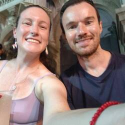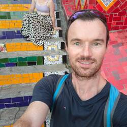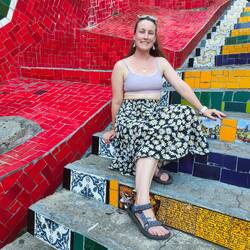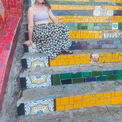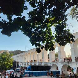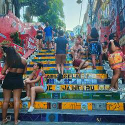 After our visit to the cathedral, we shared some acai, Allan's obsessed, and headed about 10 minutes down the road to the aqueduct. It was pretty cool to see a tall aqueduct running through the middle of the city. The white arches really stood out. The sightseeing experience was a little tainted by all the drunken street partiers scaling the aqueduct and relieving themselves all over the surrounding area. We certainly weren't in the nicer parts of Rio anymore. We left the aqueduct and went a couple blocks to Escadaria Selarón. The stairs were designed with painted tiles by an artist, Jorge Selarón, who lived nearby and hated how ugly the stairs were. He still regularly painted tiles to replace and add to the stairs until his death in 2013. The stairs were really cool, but again, packed full of drunken Carnaval party people. We walked to the very top of the stairs where it was much quieter, and so Allan could say he walked all of the stairs, and we took some pictures where there weren't as many people.