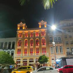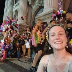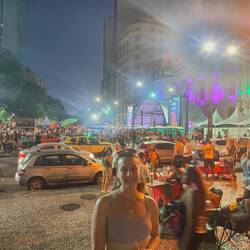 We left the stairs and went back towards the theater towards the street party. The sun was going down and the party was in full swing when we arrived. It was busy, but not crazy like some other parties we had seen or heard about. We grabbed a couple of caiprinhas (holy cow the amount of alcohol in those bad boys!) and made our way to the steps of the theater. From here we had a place to sit and watch the party and dance to ourselves without getting tangled in the mess of glittered, mostly naked partying people in the square in front of us. The music was good, and the people watching was too. While we sat and enjoyed our drinks and the atmosphere, talking with each other, a guy next to us started to talk with us in a mixture of spanish and english. I was wearing my llama earrings and he wanted to know if we had been to northern Argentina, where he is from. We told him about our trip, and he told us about northern Argentina and what brought him to Brazil. It was great to talk with him! We decided to share one more caiprinha before we headed back to the hotel.