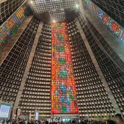 When we arrived at the cathedral, we were surprised by the shape. It reminded me of the cult temple in Brasilia. It's cone-like shape didn't really scream cathedral and if you just walked past it we wouldn't have known it was the cathedral. When we walked up to it, Mass was taking place so we stood in the open doorway like many others to admire the space and listen. Along the four 'sides' of the cathedral were large stained glass windows that almost went floor to ceiling. It was very plain inside except for those windows, but the acoustics with the concrete building, size, and shape, were amazing. The sound of people singing was powerful and you could hear it from at least a block away.