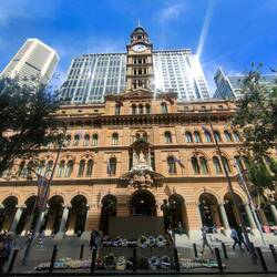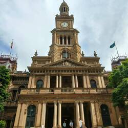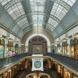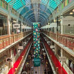 Next door to the cathedral is Sydney Town Hall. It was a pretty cool building , especially from the side when you could see all the different towers and sections. There were also some interesting red artificial flowers decorating part of the exterior. It was sadly closed for visits, so we walked across the street to the Queen Victoria Building which is a shopping center. The building looked like a standard shop or government building from the outside, similar to town hall, but it extended pretty far back for about a whole block. Looking at it from the side helped appreciate the size. We walked into the building and up to the top floor. Each floor has different mosaic tile designs. There was also a red and green glass dome in the center of the building. Hanging from the ceiling were two large clocks. Each has different moving designs. The first one we saw was more playful with little doll-like characters revolving and moving to change the scene. The second has different scenes that relates to the history of Australia, like James Cook's landing. It also has the days of the week on it.