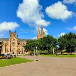 After our visit to the barracks, we walked through Hyde Park over to St. Mary's Cathedral. This was a huge building, unlike St. Andrew's. It wasn't highly decorated inside, but has some lovely paintings of the stations of the cross as well as some nice stained glass windows of some of the saints. The naves were very wide and spacious and the vaulted ceilings were very high. We didn't stay long so we could get the Manly Fast Ferry and see the opera house.