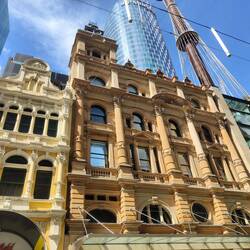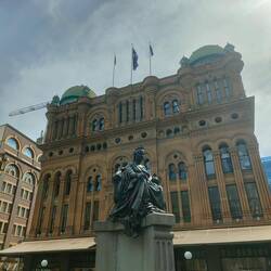 After we walked through the Queen Victoria Building, we went across the street again and had a peak at the State Theatre, the most beautiful theater in Australia. Guided tours are available on Thursdays, so we had a small look around the room that was open to the public, and took a picture of the outside. The outside of the theater didn't reflect the opulence inside. Now used for live performances, it used to be a place to go and watch movies. The tiled floor and gold ceiling were a fraction of the fancy decor that we peaked through heavy iron doors to see in the next room with marble landings and flooring. It would have been a cool building to look around.