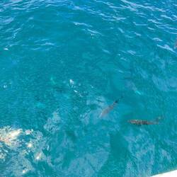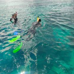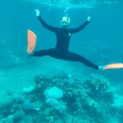 Back on the helipad after our flight, we watched some big fish and saw some manta rays while we waited to head back to our bigger boat. As soon as we got back on the boat, we got our stinger suits on and jumped in for a snorkel. The reef was much shallower here and much more colorful than the first reef. I couldn't believe all the colors we saw here. And because it was so shallow, we were really close to the coral and could see it up close. I wish we had more time at this reef because the snorkeling here to see the corals was really special. It almost looked like a blue light was being shone underwater because of how neon some of the sections were.