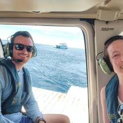 Our second location was Hastings Reef. Before we got our things on to snorkel, we got ready for our helicopter ride. We were one of the first groups for the ride which was great because we could then get straight into the water. We got a short boat over to the helipad, got life jackets on, and got in the helicopter for our 10 minutes in the sky.