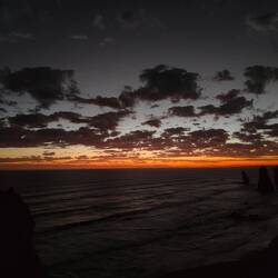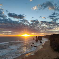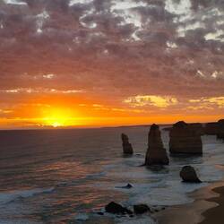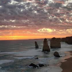 After getting stuck behind a couple of slow people, we managed to get to Twelve Apostles about 10 minutes before sunrise. We ran through the parking lot and up the 1km path to the lookout. We got there just in time to see the sun leaving out from behind the clouds on its way down to the horizon. The sky was beautiful with bright oranges and reds and as it descended beyond the horizon, the clouds lit up a lovely pink color. We stayed a little bit after sunrise to try and see if the sky would light up any more, and to try and spot Little Penguins that come out at dusk. The sky turned a grayish color, so we walked to the other viewpoint before heading back to the carpark.