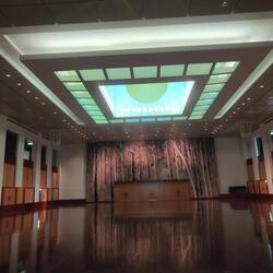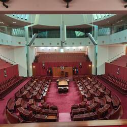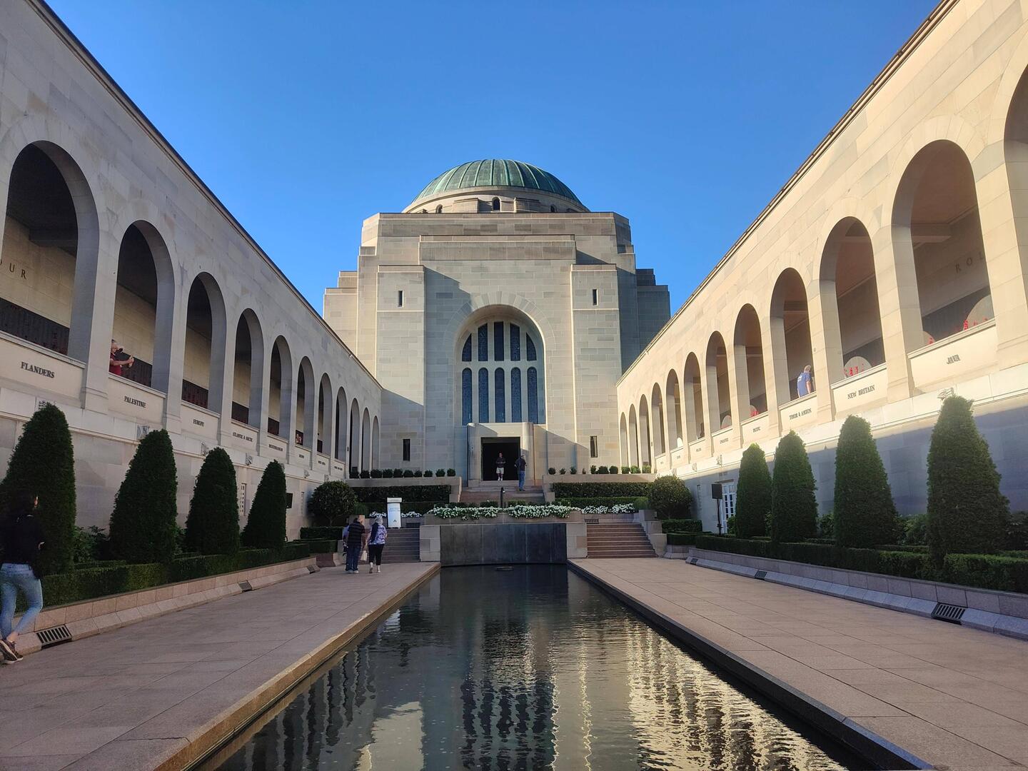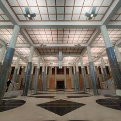 After the war memorial, we hurried back over to Parliament before that closed in just under an hour. The entry foyer is composed of marble and the black sections of marble have fossils in them. One of the prawn fossils is called Steve apparently. We walked straight through the foyer to the Great Hall. The huge room has wooden panels and a shiny wooden floor. The back wall has a colorful mural. We left the Great Hall and ascended the white marble staircase on the left side of the foyer. There was a balcony around the edges of the Great Hall, so we had a quick peak at the bird's eye view before moving on and trying to find the Senate Chamber. Our time was limited and a security guard gave us a 5 minute warning as we made our way to the Senate. We quickly went in, for some pictures, and power walked across the building to the opposite side where the chamber for the House of Representatives is. They both looked pretty standard to me, but I'm sure we may have learned more on the tour we missed.