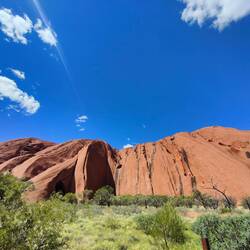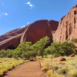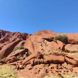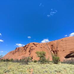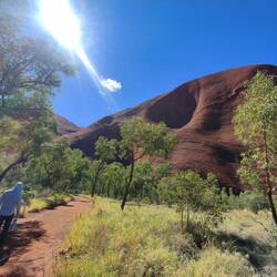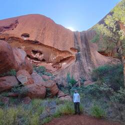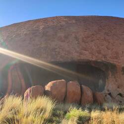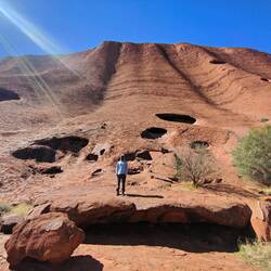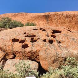 Our walk around the rest of Uluru didn't have as many explanations of the different parts of the rock face or caves. There were a couple sections with cautionary tales, like myths, about how the rock sections were formed, such as a strong woman turned rainbow snake and thieving emu hunter. They were interesting to read as many traditional tales and origin stories can be. The other signs we did see as we walked around denoted if it was a men's area or a women's but didn't elaborate. It was a nice walk, albeit hot after stopping in the kitchen cave for about half an hour to work out some travel from Adelaide back to Sydney. It was cool to see Uluru up close. At points I thought it was a bit like Swiss cheese with all of the holes in it. I also liked how close and personal it felt to get near Uluru after seeing it from further away.