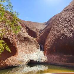 Our walk continued to Kantju Gorge, a watering hole around the corner where a large waterfall sometimes falls off the side of the rock and empties into a pond. Animals gathered here as well as humans. You can tell where water falls from the top of the rock because those parts of the rock are black. I especially liked being able to see all the different patterns that falling water made on the rock as we walked around it.