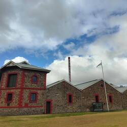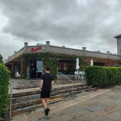 After about ten minutes, we arrived at the winery. The skies were gray, and it was a bit drizzly, so we took a couple pictures outside before making our way in. The tasting room was a rectangle with a bar in the middle, smaller tasting rooms along a long wall, and then a myriad of different sized circle and square tables for walk in tasting. There was also a long bar area behind the serving bar for guided tastings after tours. There were glass cases with expensive collector's bottles including a long case of 'The Grange,' a bottle for each year since they'd been making the wine range. The most recent bottle sold for more than $160,000 (Aussie dollars, but still pretty crazy).