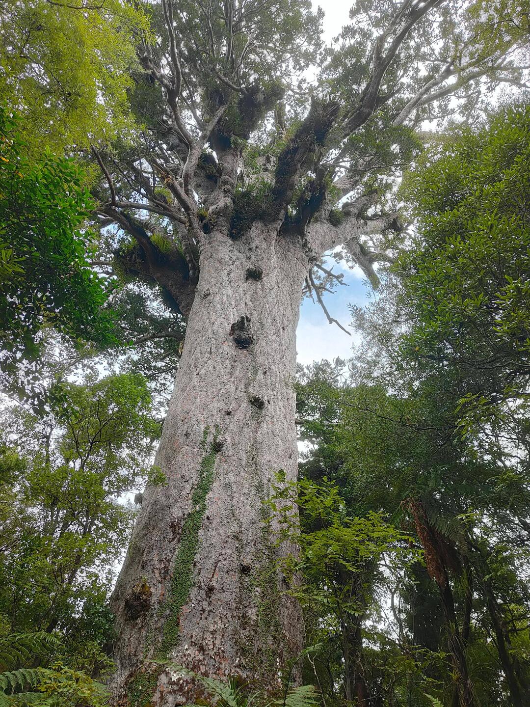 The Waipoua Kauri Forest was full of kauri trees. Our first stop was Tane Mahuta, the largest, by volume, kauri tree. We walked the short distance along the boardwalk to the tree, there was a woman talking about the kauri trees when we arrived. She told us that the trees live for 8,000-10,000 years and begin to hollow out from the middle as they get older. This tree isn't the oldest which is why it has a higher volume than the oldest tree in a different part of the forest. This tree is also known as "Lord of the Forest" and has over a dozen other plant and tree species living in its branches.