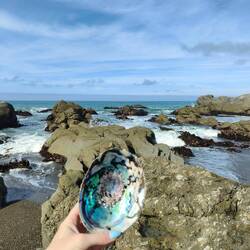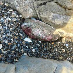 We walked further down the beach where it turned from rocks and pebbles to sand. It was here that we started to see paua shells. They were smaller at first, a little smaller than the palm of my hand or smaller, and they were light in color, almost white. Then, Allan found a big one with the purple coloring that we've been seeing on paua shells in stores. The outside was rough and, obviously, not the smooth and shiny color that matches the inside like the ones in the store that have been sanded and treated.