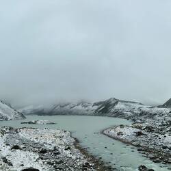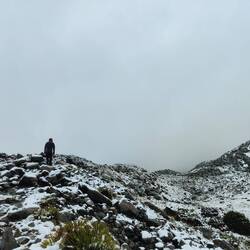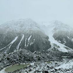We continued along the trail until we saw the first swing bridge, unfortunately fenced off, going over a glacier river. The clouds were still pretty low and it was clearly snowing at the tops of the surrounding mountains. We went off the main trail and up some rocks to get a higher view of the glacier lake and what would be Hooker Valley in the distance. We also thought we could see the second broken swing bridge in the distance.