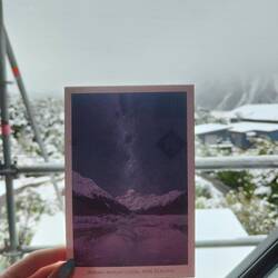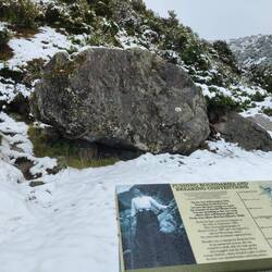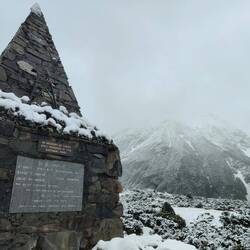 We got back in the van and drove up to the campground for the first half of our plan. We got all layered up and hiking boots on. With all the foot traffic on the Hooker Valley trail, most of the snow was slushy or compacted and a bit slippery. We started walking through some bushes along the gravel trail. There were a couple of small things to see just off the main trail. The first was Freda's Rock, a large rock where a woman, named Freda, has a picture taken after being the first woman to summit Mount Cook. Further up the trail was the Alpine Memorial dedicated to people who have lost their lives on the way to/from the summit. It was first made for people who died in an avalanche in the early 1900s, and since then small plaques have been added to remember others.