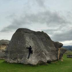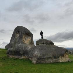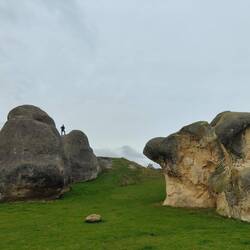 In Takiroa, just off the road, there's some Maori rock art. Apparently there's a fair bit of rock art at different locations in that area. We took some pictures and then got back in the car. It was a quick stop. Then we stopped at Elephant Rocks. These are huge limestone rocks coming out of the ground that have been weathered to sort of look like a herd of elephants. Allan has a great time here running around and climbing, and trying to climb, the rocks. There was a lot more than I expected when we pulled off! And it was quite reminiscent of Scotland because it was on someone's farm and there were some sheep around.