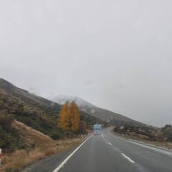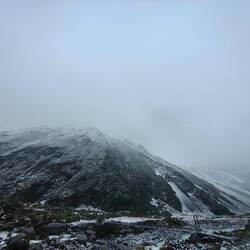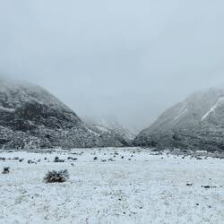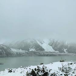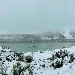 We were a bit slow to leave the warmth of the blankets, so didn't get up to the visitor center as early as planned. The drive started off with rain turning to winter mix to snow. The terrain gradually got snowier as we got closer to the mountains. The clouds were lying low and you could see a decent blanket of snow lying on the top half of all the mountains. We could see Mount Cook in the distance at one point on the drive it was a blanket of white and clouds. Lake Pukaki stayed on our right pretty much the whole way up and the mountains stayed on the left. As we got closer to Mount Cook the snow was lying thicker on trees and mountains. It did look quite magical.