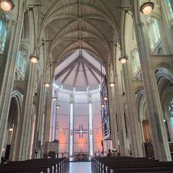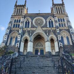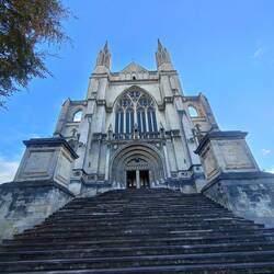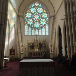 Before leaving The Octagon, we stopped in at St Paul’s Anglican Cathedral. It's an impressive building of gray stone and the inside is plain, but also a bit modern with how they chose to decorate the sanctuary area. There was also a huge organ in the front of the church and some nice stained glass windows. Moving away from The Octagon slightly up the street was another church, this time a Catholic one, St Joseph’s Catholic Cathedral. This building was definitely more impressive than St. Paul's. It had ornate stone carvings at the entrance and when we went inside there was a huge, pastel rose window behind the altar as well as pastel stained glass windows higher up in the church. At eye level were classic stained glass windows.