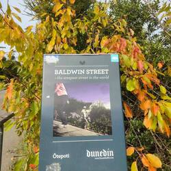 After playing at the boulders, we walked back along the beach to the van and finished the drive to Dunedin. It's about an hour from the boulders. Our first stop in the Scottish settled city was Baldwin Street, the steepest residential street in the world. Being a residential street, a lot of the houses have cute little gardens because they know people will visit the street. A lot of people forgot it was still a street and laid down in the road to take pictures and got honked at and nearly run over 🙄. We walked up the sidewalks to the top of Baldwin Street where there is a bench and water fountain as well as a nice mural behind the bench. There's also a plaque to commemorate regaining the "world's steepest residential street" title from the Welsh in 2019.