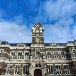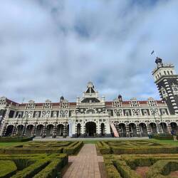 We started the loop around the city at Dunedin Railway Station. This is a beautiful building with black and white brick and looks like a big, fancy gingerbread house. Inside the main foyer was tile mosaic flooring as well as some stained glass windows with a second floor balcony that allowed you to see down to the ground. They have an art center and a Sports Hall of Fame in the building too. Across the street was a similar brick building, but this building was the Law Courts. We couldn't go inside here, but Allan probably would've if he could've.