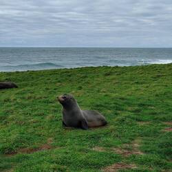 Once we did head out, we back tracked towards Moeraki Village and down to Katiki Lighthouse. The lighthouse was short and seemed very inland to be a working lighthouse, but it must still be effective if it's still in operation. We continued down the path until it opened up to the coastline. Initially there was fencing which blocked the view of the seals lazing in the grass, but we continued down the path past the fences and the path opened up into a grassy area with plenty of seals all having a morning snooze. Some saw us and ran towards the water, others didn't care and just looked at us before going back to sleep.