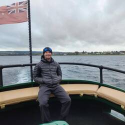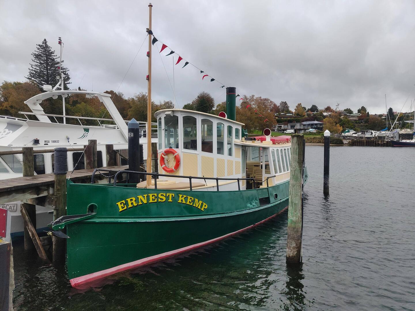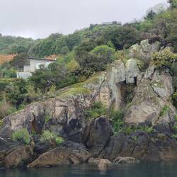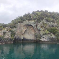 We had breakfast and boarded the Ernest Kemp, an old timey steamboat and headed out onto Lake Taupo. The rain cleared up a little, but it was still pretty overcast. The boat took us along the coastline on our left hand side before cutting into the coast on the right where the rock carvings are. It was much bigger than I expected. The face was framed by intricate Maori designs and lines. The carver abseiled down from the top of the small cliff in order to make the carving. The nearby rocks leading into the water also had smaller carvings on them of animals and people that we didn't even notice at first. We made a couple circles to get a good look at the carvings before making our way along the other coastline back to port. The sun made an effort to peak through the clouds very briefly before the clouds swallowed it up again.
