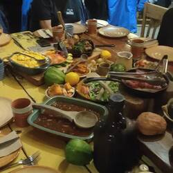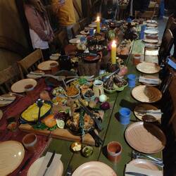 We left the inside of the hobbit hole and made our way down the path to the Green Dragon. We walked over a little stone bridge towards the cozy looking pub. There were colorful lanterns strung up all around outside and when we walked in there was a roaring fire in here too. There were a couple of cozy armchairs in front of the fire and several wooden benches and chairs around tables throughout the space. I grabbed a Southfarthing Stout and sat on a bench with pillows near a window. I chatted with fellow LOTR fans until it was time for dinner and then we went through to quite the sumptuous banquet. The tables were laden with food: sausages, lamb shanks, chicken, Poh-Tay-Toes, roast veggies, vegetable pie, and so much more. I had two plates and I was stuffed. We cleared the room for about 10-15 minutes while they cleared away dinner and went back in for some cute, and very British, desserts. There was a lot of fruit, bakewell tart, sticky date pudding, apple crumble, and pavlova.