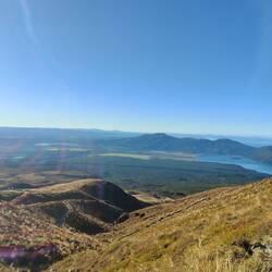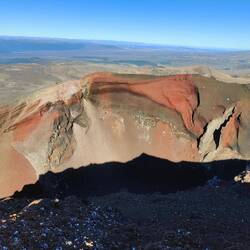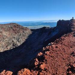 We clambered over the last section of loose rock and boulders reaching the outer side of the crater, we had to go down into what was almost like an inner valley and back up to get to the inner crater and look inside the infamous, and active, volcano that is Mount Doom. The inside was littered with rocks of varying sizes and colors. Allan ran ahead, excited to be at the top. I was pretty terrified of slipping on all the loose rocks on the sidewalk sized edge of the crater, so I took my time; it was a long way down into the volcano, and to the bottom on the other side. I got closer to Allan, admiring the view from the top, and thankful that I had made it up. Based on everything Allan had said, and my previous experience with scree, going down would be a little scary, but wouldn't take nearly as long as going up. I took the time to admire the view and watch Allan as he ran all the way around the crater, and then for funsies decided to run down into the crater itself. Thankfully, he didn't go all the way to the center, but it was definitely a little dangerous! I kept an eye on the blue shirted speck down in the crater on one side of me, and looked down at the red scree and rock to the other side where we would soon be exiting the summit.
