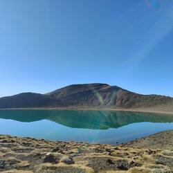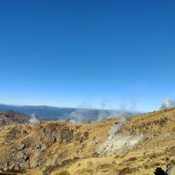 This middle section had some good views with a variety of lakes. The first was a series of green lakes with steam vents all over the place. The Emerald Lakes were true to their name and a vibrant green color. After taking a picture of them, and the Blue Lake in the distance, we started the walk down. I got deja vu because the sliding rocks on this path and the steepness felt similar to the scree and rock on the way down from Mount Doom. Not only did I not want to fall again because it would hurt, but there were a hell of a lot more people now to witness it if I did. Slowly but surely I made my way down, all the while hoping the whole rest of the trail wouldn't be like this because my legs were in agony and it would take me forever, eventually making it to the shore of the Emerald Lakes. The smell of sulphur was strong here and the ground was clay like in some parts. I took some pictures before I headed back onto the main path to continue the trail. Allan decided to run around the back section of the lakes and explore some more.