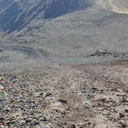 After Allan returned to the edge of the crater, we took our final pictures, marveled at the achievement, and then started to look for the way down. Because of the way the crater went in, we couldn't see over the initial part of the mountain to the lines of scree where people had gone down before. We looked for the least rocky sections for areas of scree where we could slide through and therefore down the mountain. It was not easy. I think we may have zigzagged more sideways across the mountain going down than we did on the way up. We would find sections that were ok with fewer chunky rocks, only to be thwarted after a few meters and have to cross horizontally to a different area. It was also steep. Very. Fucking. Steep. I couldn't stay on my feet. It was a horrible cycle of slide a few steps on my feet, shuffle, fall (hard) onto my ass, and then begin falling down the mountain by sliding on the lava rock frantically trying to stop myself. Allan was a few meters in front of me and I then got concerned about all the rocks that I caused to fall in his direction every time this happened. He then had to shout "rock!" to anyone below us as the rocks I stirred up from slip and sliding down the mountain gathered dangerous speed down the steep mountain for unaware people at the bottom.