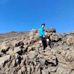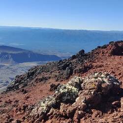 The entire mountain is made up of volcanic rock of varying sizes: tiny scree pebbles, chunky rocks, and boulders large enough to climb. We couldn't scramble straight up the scree covered mountain, so we zigzagged up a combination of scree, loose rocks, and boulders. Scrambling and climbing over the boulders was difficult at times, but at least it felt like we made forward progress compared to the small sections of scree between the boulder sections. The rocks were pretty sharp and a mixture of red and black lava, getting progressively redder the closer we got to the top. Despite it only being about 5 kilometers, the 1400-meter ascent made the climb take longer than anticipated. Allan was incredibly patient, and often scouted the route ahead to make sure it wasn't too tricky for me.