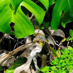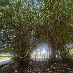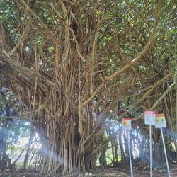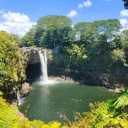 We left for Hilo a bit later than planned after getting home late last night watching lava. Our first stop was Rainbow Falls. When the light shines onto the waterfall and there is enough water pouring into the pool, it forms a rainbow into the pool on the waterfall mist. It was a beautiful sunny morning, but there hadn't been a lot of rain recently, so there wasn't enough water to make mist for the sun to shine on. It was still a pretty place, and there was a huge banyan tree nearby.