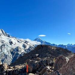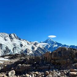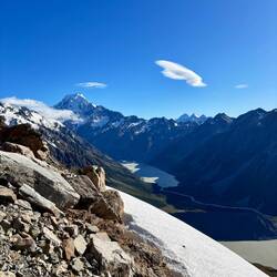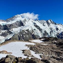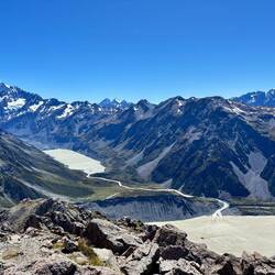 In 1862 gaf hij de eer aan Ferdinand von Mueller een collega wetenschapper en ontdekker die zich in Australië ophield. Bijzonder collegiaal. Feitjes opzij gelegd, de wandeling ging verder. Een relatief vlak en rotsig pad liep totaan de berghut. Onderweg kwam je langs spiegelglad opgevroren sneeuwmassa's, die geniepig afliepen naar de afgrond. Zaak was dus om niet op dat ijs te stappen. Gelukkig was afgelopen genoeg gesmolten om over de rotsen te kunnen en zorgvrij bij de hut aan te komen. En wat een fantastisch uitzicht was dat! Een bijna 360 graden uitzicht over de gletsjers, Sefton, Cook, de meren, en de vallei achter je. Samen met een ouder Schots echtpaar en drie Zwitsers hebben we geluncht met dit uitzicht.
