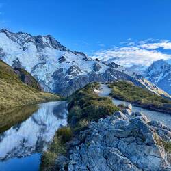 Maar, een kilometer van de hut vandaan werd het wel heel erg steil. Ondanks dat juist dit stuk goed aangegeven was met paaltjes, was het alleen maar heel veel losse stenen die eindigden bij de afgrond. Omdat dit verdacht veel leek op een wandeling in Kirgizië waar ik achteraf nogal veel spijt van had, heb ik na veel dubben besloten om te keren. Zo dichtbij, maar het was maar beter zo. Na nog even heel erg genoten te hebben van deze enorme Gletsjer, de prachtige Mount Cook, en het gekke blauwe Tasman Lake, ben ik teruggekeerd. 17 kilometer later, ondanks stiekem toch wat chagrijn dat ik niet bij de hut heb kunnen komen, was ik vooral blij dat ik toch nog een (fantastische) wandeling mee heb kunnen snoepen deze reis. Door de mensenmassa heen op de parkeerplaats bij de campsite was m'n plekkie nog vrij, en heb ik weer met Mount Sefton op de achtergrond kunnen genieten van m'n maaltje.Read more
