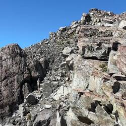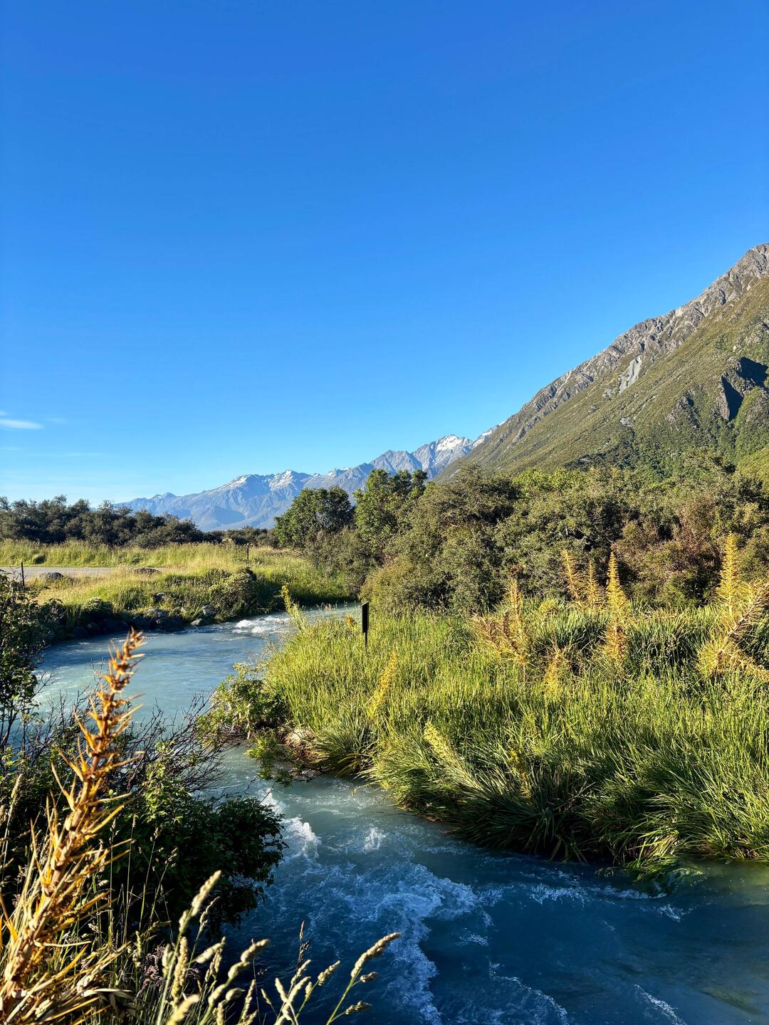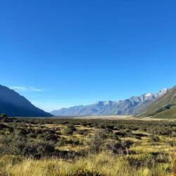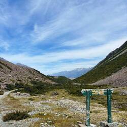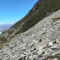 De track zou verderlopen naar Ball Hut, iets minder dan 5 kilometer verderop in de richting van Mount Cook. Maar door een lawine is het pad in 2019 weggevaagd, en is er een diepe kloof ontstaan waar Husky Stream doorheen stroomt. No way dat je daar dus overheen kan. Maar, er schijnt dus een alternatieve route zijn ontstaan die een eind de stroom volgt, wat hogergelegen grond is en waar je over het riviertje op de andere kant kan komen. En terwijl ik daarheen liep, kwam ik zowaar twee mensen van de DOC tegen! Wie kan er me beter vertellen of het inderdaad kan en of het veilig is? Ze vertelden dat zij net van de hut vandaan kwamen en dat het mogelijk is. Het 4wd weggetje is alleen door lawines wel de rest van de route weggevaagd, dus ze vertelden dat de route voornamelijk over losse rotsblokken gaat. Wel uitkijken dus. Na de rivier overgestoken te hebben kwam ik op een wat geïmproviseerd pad dat steil de bosjes en de berg opliep, en daarna steil naar beneden keurig weer aan de zijde van de gletsjer uitkwam, waar het pad ooit heeft gelopen. Daarna volgde inderdaad een rotsige route, waar soms de route onduidelijk was. Er waren weinig oranje paaltjes, dus de precieze route was vaag. Omdat je rechts de afgrond naar de gletsjer had en links de berg, was het in ieder geval duidelijk dat je rechtdoor moet. Gelukkig hebben eerdere wandelaars met stenen torentjes aangegeven wat de beste route was, dus op die manier kon ik toch mooi m'n weg vinden.