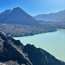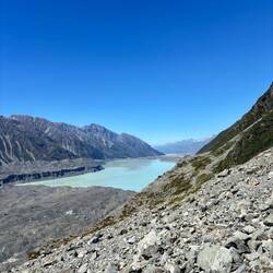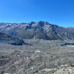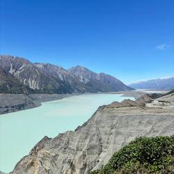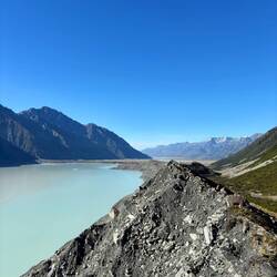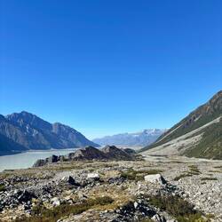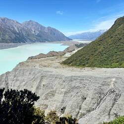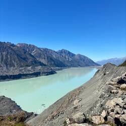 Uiteindelijk liep dit uit op een rivierbed, waarna ik bij het uitkijkpunt uitkwam. Inmiddels in de brandende zon, die zorgde dat het kwik na maar een paar uur na de vrieskou al naar 25 graden was gestegen. Een heel mooi grauwig blauw gekleurd Tasman Lake stond op me te wachten. Er dreven wat ijsrotsen in, maar waar de gletsjer nou was zag ik in eerste instantie niet. Toen pas begreep ik dat al dat zwartgrijze gruis wat tegen het meer aanzat geen landmassa was, maar een ijsmassa! Door alle lawines is de hele gletsjer bedekt met stenen en gruis. Maar het was ongelooflijk hoe enorm deze gletsjer is zodra ik besefte dat letterlijk alles totaan Mount Cook ijs was! Als grootste gletsjer van Nieuw-Zeeland, is hij 23.5 kilometer lang, is ie 4 kilometer wijd, 600 meter diep, en heeft ie een oppervlakte van 101 vierkante kilometer! Ik kan nog steeds niet bevatten hoe enorm dat is.