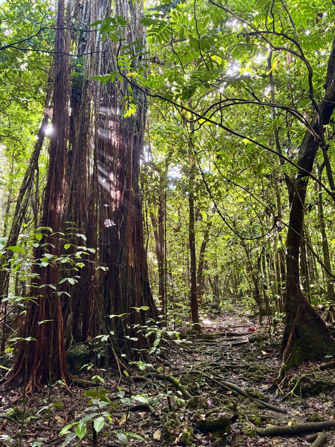 Die middag ben ik alleen nog wat plekken langs de oostkust afgegaan, waaronder Anapala Chasm. En om eerlijk te zijn... dat was geen hele relaxte duik in het water. Deze kloof was heel smal, heel diep, en vooral heel erg donker. Met elke stap naar beneden werd het donkerder, totdat je onderaan alleen het licht boven, achter, en in de verte zag. En tussen mij en het licht in de verte was water! Het was niet meer dan een meter breed, maar in de klif lag zoetwater, de enige plek op het hele eiland! En ja, je kon er dus in zwemmen... De eerste stappen waren oke, een soort van belicht, en je kon de bodem nog zien. Maar daarna kwam je echt in de donkerte te zitten, en was het blijkbaar zo diep dat je de bodem niet meer kon zien. En ondanks dat er niks gevaarlijk was, geen gekke beesten of rotsen waar je onverwacht tegenaan kan stoten, was het eigenlijk toch wel vrij eng haha. De donkerte, het smalle en benauwde, en dan ook nog de stilte, behalve de druppels die vanaf boven het water invallen met hoge plopgeluidjes en soms een krabbetje die wegschiet, maakte het een lugubere duik. Aan het einde was weer licht, en kon je weer op de bodem staan en omhoog naar de planten kijken. Al met al een bijzondere plek om te zwemmen! Wel gemaakt voor duistere baantjestrekkers overigens.