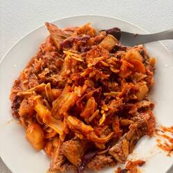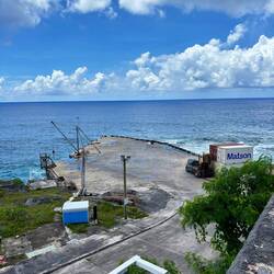 Voor de rest is in Alofi ook de enige haven te vinden van het land. Althans, haven... een korte pier, een groot uitgevallen schuur, en een paar zeecontainers. Eén keer per maand komt er een vrachtschip langs om goederen af te leveren. Zoals gezegd zijn boodschappen daardoor erg duur, en is er erg weinig keuze. En de paar verschillende winkeltjes die er zijn vind je exact dezelfde producten waar je het maar mee moet doen. Verse groente zijn er ook heel erg weinig, en al het vlees is ingevroren. Voor lunch heb ik de Crazy Uga uitgeprobeerd, volgens de mensen die ik heb ontmoet het beste cafeetje van het land, puur omdat ze hier als enige goede koffie maken. Een super schattig tentje, met zes tafels, maar vooral met een prachtig uitzicht! En ook hier was de keuze niet reuze.