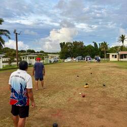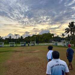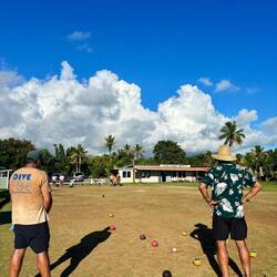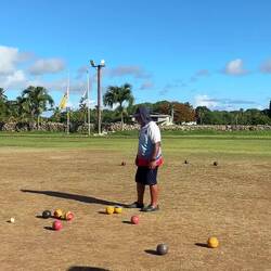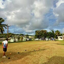 Maarrrr, eind van de middag stond Lawn Bowl op het programma! Ik hoorde dat ze vandaag een wedstrijdje hadden georganiseerd omdat ie afgelopen zaterdag dus niet door ging, en dus ging ik weer langs. Nu waren er wel mensen, en heb ik de bijna hele club kunnen ontmoeten. Oh ja, dat zijn zo'n acht mensen. En zes daarvan zitten in het bestuur, die allemaal hun eigen parkeerplek hebben haha. Het was al het eerste teken dat ze hun sport erg serieus nemen. Het waren allemaal wat oudere Niueans, en zo te zien ook de wat welvarendere bewoners. Ze zijn deze Lawn Bowlclub in 2013 begonnen, en doen sinds 2014 ook mee aan internationale wedstrijden die worden georganiseerd door alle Pacifische eilanden, en eens in de vier jaar tijdens de Commonwealth Games! Ze droegen dus met trots hun officiële wedstrijdkleding, en begonnen me na een klein kletspraatje al flink te trainen.