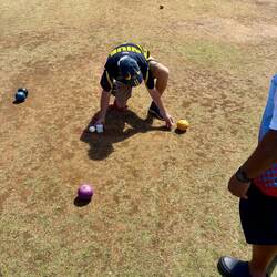 Ik wist niet wat de sport inhield, dus ze moesten bij de basics beginnen. Kort door de bocht is Lawn Bowl hetzelfde als Jeu de Boules, maar dan met een heel klein beetje meer techniek omdat de bal aan 1 kant zwaarder is, en je hem dus in een bocht naar het witte balletje moet brengen. De ballen zijn wat groter, en de afstanden ook. Voor de rest kan je hem nog uit gooien als je bal in de goot gooit aan het andere uiteinde van het veld, en moet ie tussen twee paaltjes terecht komen, anders is het ook uit.