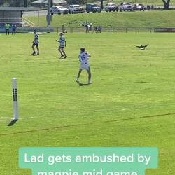 Magpie swooping season is begonnen! Mag wattes (ook mijn eerste reactie)? De Magpie is een vogel die hier leeft, en de vrouwtjes gaan broeden rond deze tijd. En de mannetjes... die worden lichtelijk agressief. Om hun nest te beschermen, vallen ze praktisch alles aan wat in een straal van 100 meter in de buurt komt. En dat voot zes weken lang, totdat de jongen uitvliegen.