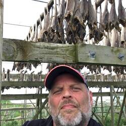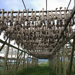 Das sind Kabeljau (Dorsch) Köpfe die hier zum trocknen hängen. Richt ähnlich wie Surströmming😅, haben nur noch nicht rausbekommen 🤔