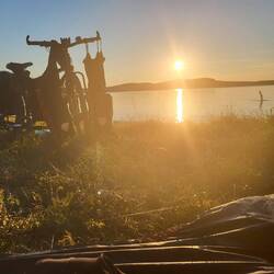 Vier Kilometer später schlagen wir unser Zelt an einem Sandstrand auf und machen ein Feuer an. Hier liegt ausreichend sehr sehr trockenes Holz herum und mittlerweile sind wir geübte Lagerfeuer-Zauberer. So können wir über der Glut kochen und gleichzeitig die Mücken fernhalten. Die Sonne scheint fleißig und wird heute Nacht nicht untergehen! Wir baden noch und Juli telefoniert mit David.Leer más