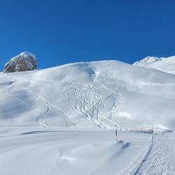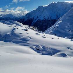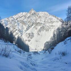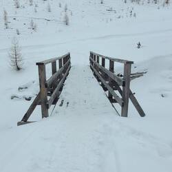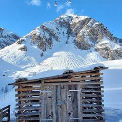 Während Markus Ski fährt, wandere ich zur Alp Bella. Es ist klirrend kalt mit sehr wenig Schnee.