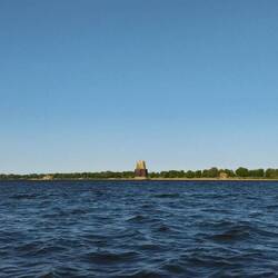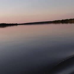 Na horyzoncie pomiędzy brzegami widać lukę, w której tylko woda styka się z niebem.