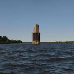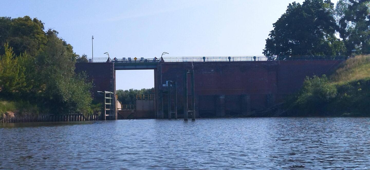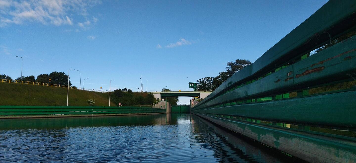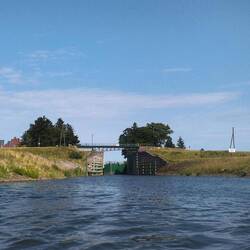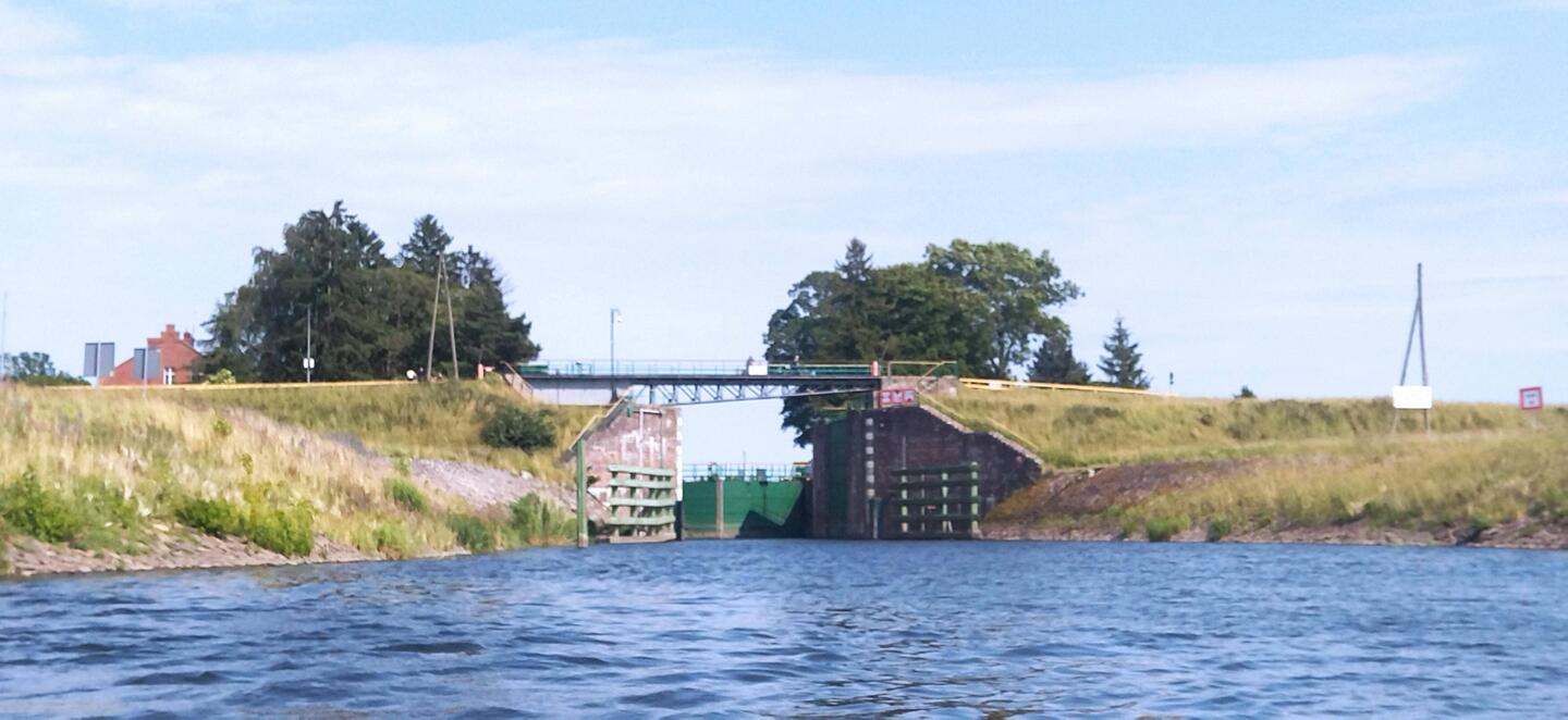 Po przepłynięciu pod prąd kilku kilometrów o 07:30 wpływam do śluzy i dostaję się z przekopu Wisły na wody Martwej Wisły. Przepływam w 5 minu, bo różnicy poziomów wody nie ma. ŚluzaLæs mere