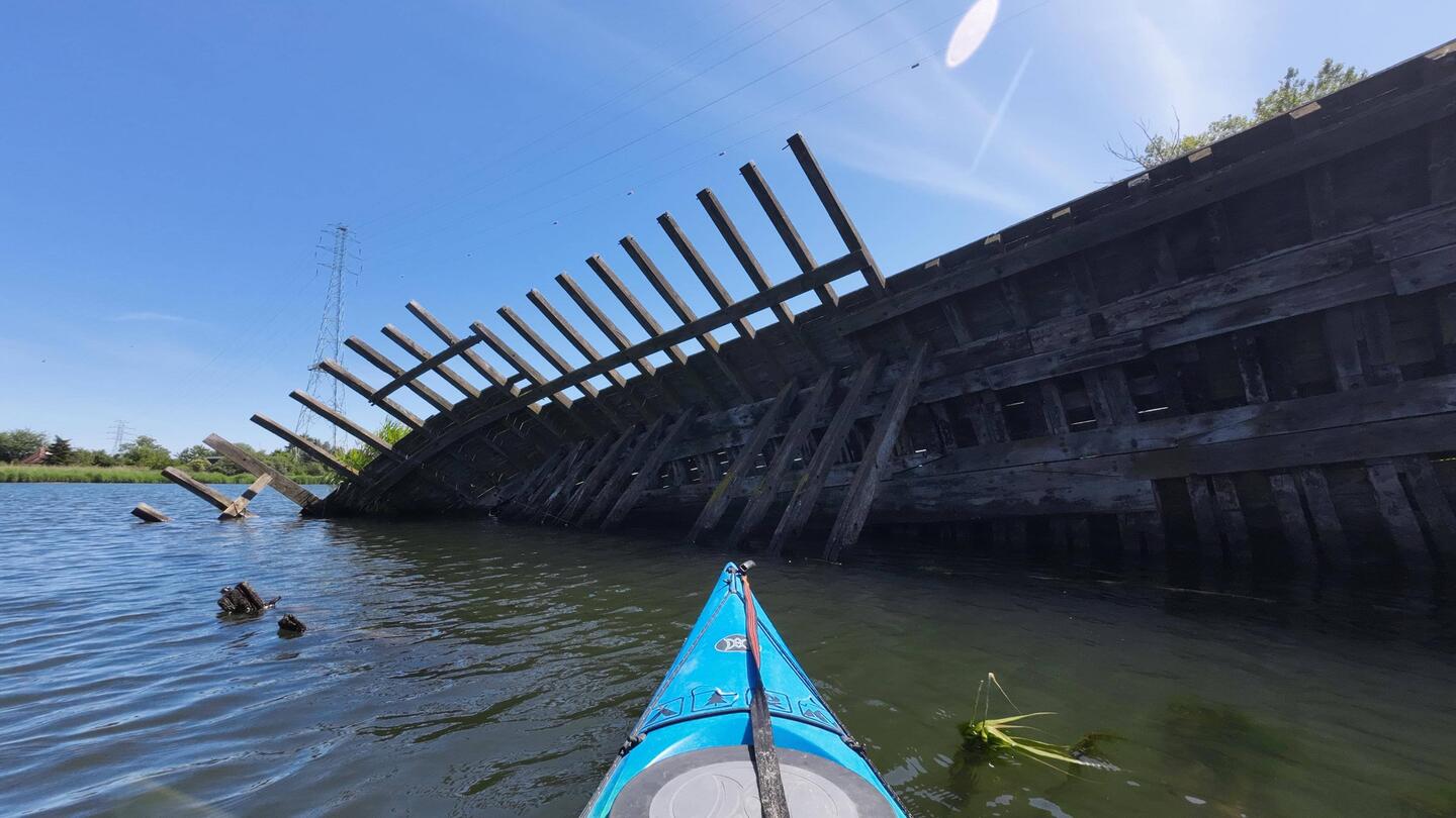 Wrak drewnianego statku. Kawał zatopionej malowniczej historii.