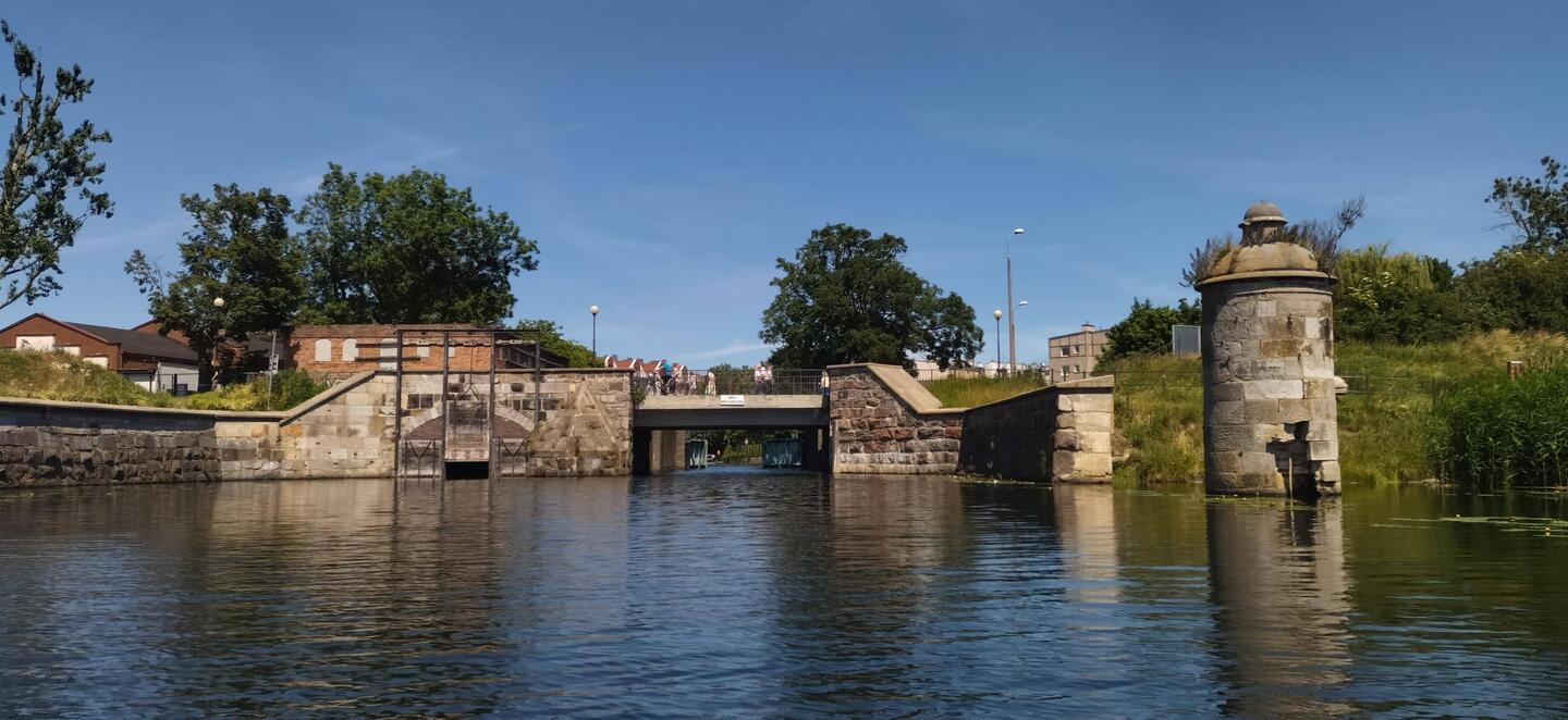 Wpływam na Opływ Motławy. Jest to fosa fortyfikacji bastionowych Gdańska z XVI wieku. Dalej na Motławę przestaję się przez zabytkową Śluzę Kamienną.