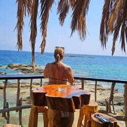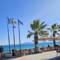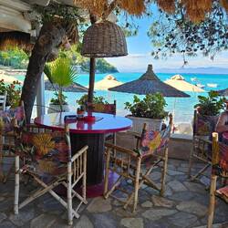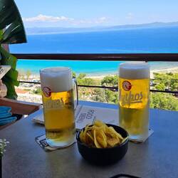 Nach einer kurvenreichen Fahrt über die Berge, haben wir den schönen Strand Tigania erreicht, von der Beachbar hat man einen tollen Ausblick auf den Strand.