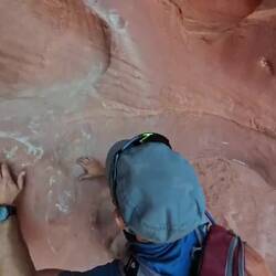 Nach einem kurzen Übergang auf der Oberfläche am Ende des Peek-A-Boo, ging es direkt weiter in den Spooky-Gulch Canyon. Beide sind zusammen als Loop gestaltet und nur in einer Richtung zu machen. 😁 Es ist schon sehr eng, wenn man seitwärts gehen muss, und den Rucksack nur in einer Hand haben kann. 😜 Nur für eher schlanke sportliche Personen zu empfehlen. Joy wäre ohne uns bereits am Einstieg gescheitert und auch an ein paar anderen Stellen wäre Sie nicht weiter gekommen.
